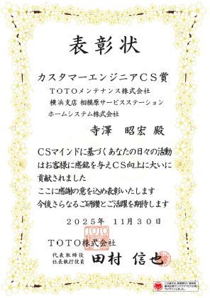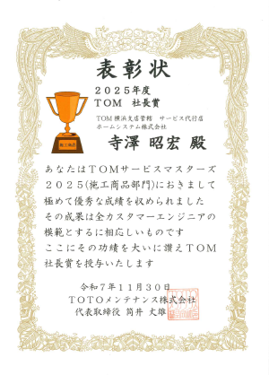 【ホームシステム】TOTOメンテナンス「サービスマスターズ2025」施工部門において、「社長賞」「カスタマーエンジニアCS賞 全国第3位」