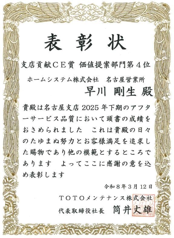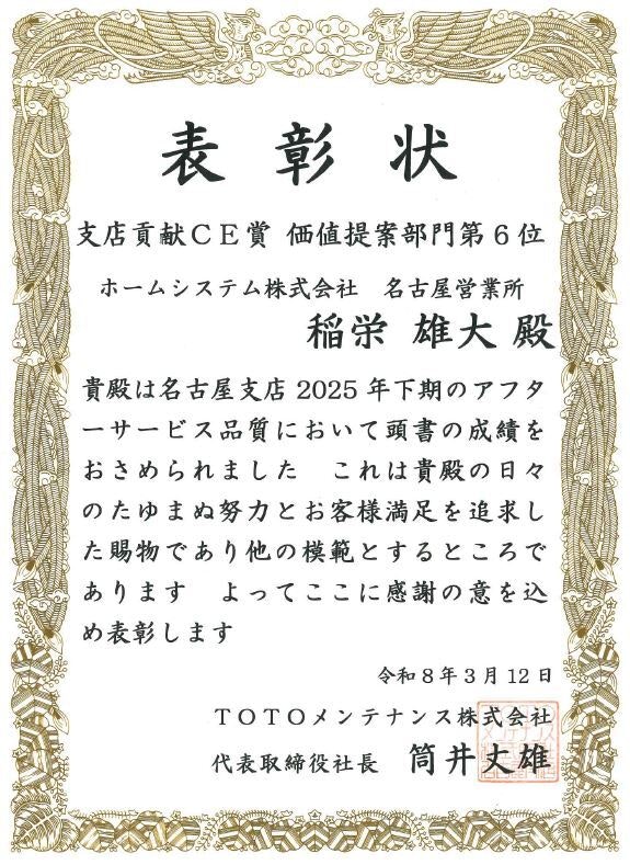 ホームシステム株式会社は、このたび「TOTOメンテナンス2025年下期 支店貢献CE賞」において、優秀な成績を収めました。